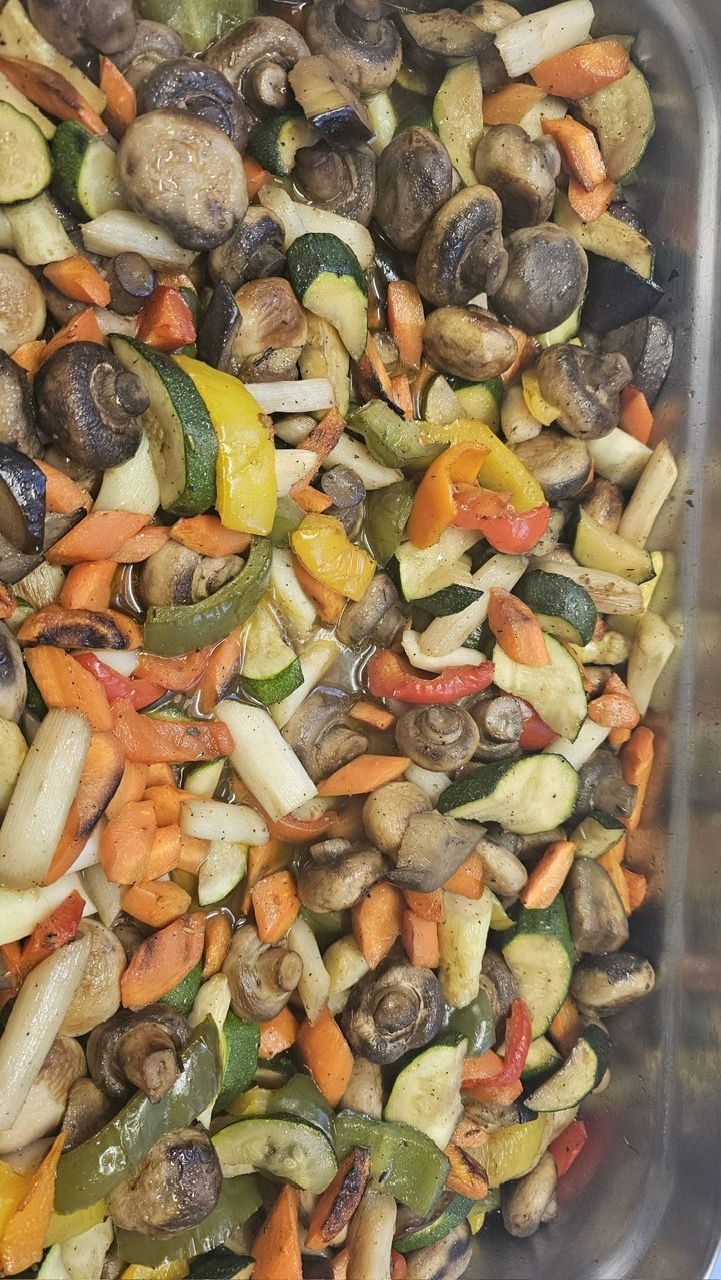 bunte Gemüseauswahl (junge Erbsen und Möhren, frische Blumenkohlröschen in brauner Butter geschwenkt, Brokkoli und Speckbohnen)