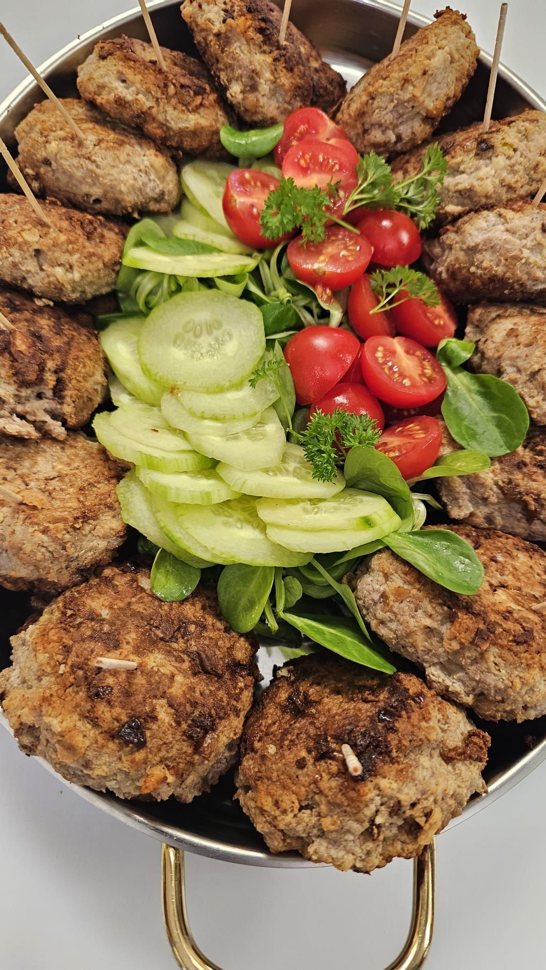 Salatplatte mit Gurken und Tomaten, Wildkräutersalat mit fruchtig süßen Cocktailtomaten